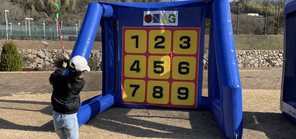 スナッグゴルフを使って、お子様でも楽しめるゲームです。当たった数などによって景品がもらえます!